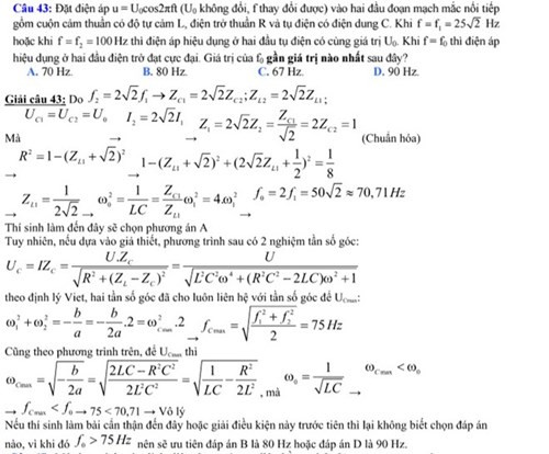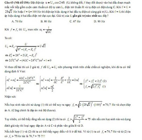 Một số ý kiến trên diễn đàn cho rằng, theo đáp án chính thức của Bộ GD&ĐT, kết quả cần tìm là 70 Hz (đáp án A - phần khoanh đỏ phía trên). Tuy nhiên, khi đối chiếu với điều kiện f1, f2 thì kết quả này không thỏa mãn yêu cầu đề bài.
