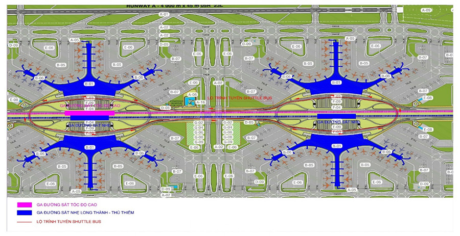 Tổng quan thiết kế sân bay Long Thành kho hoàn thành toàn bộ, với 4 đường cất hạ cánh, 4 nhà ga, công suất 100 triệu hành khách/năm.