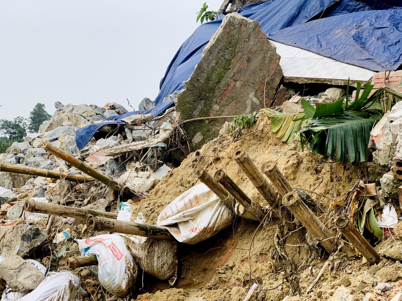 Nhiều phần mái bờ kè đã bị nước lũ cuốn trôi để lại cảnh ngổn ngang.