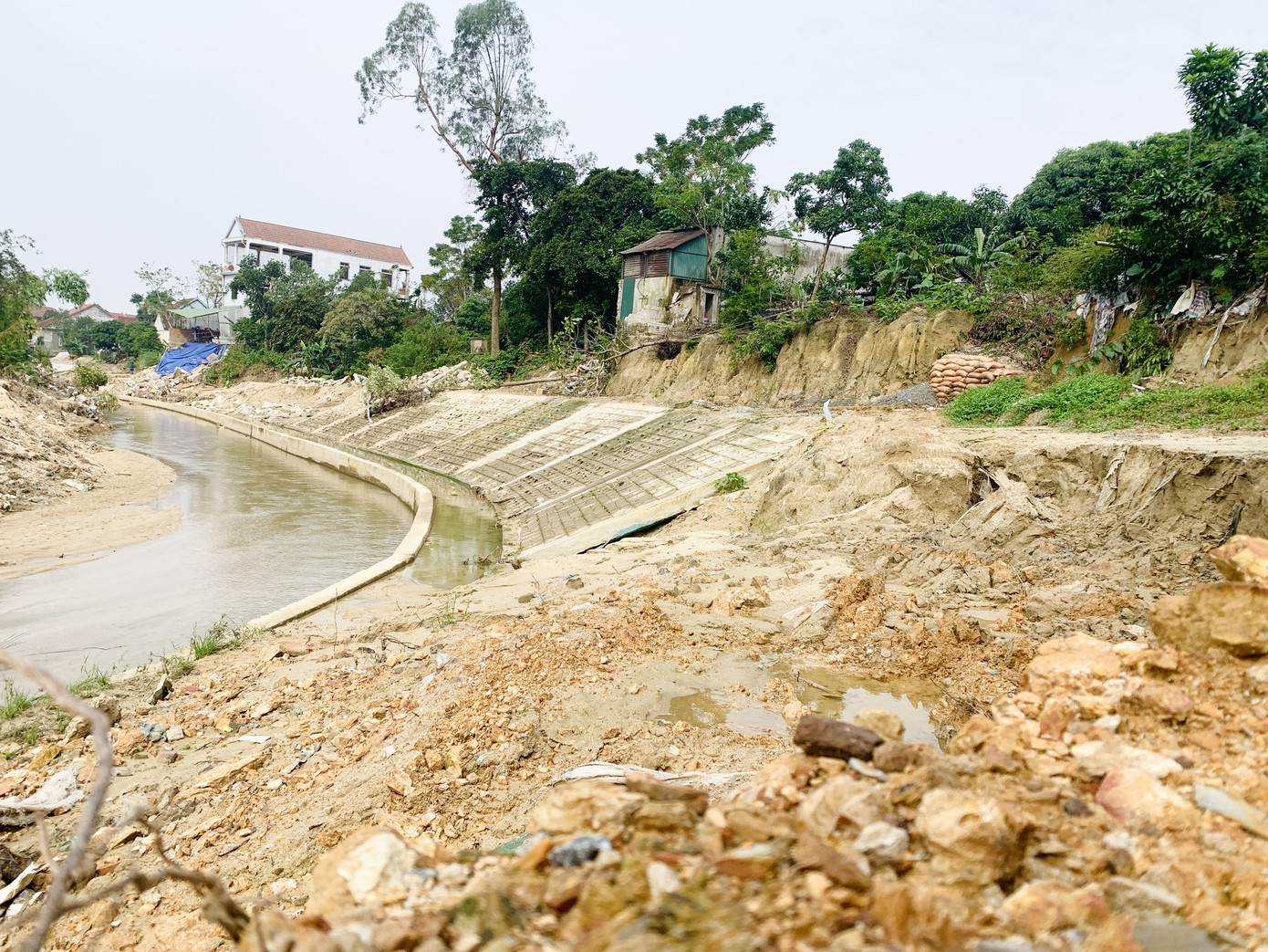 Theo ông Lê Tuấn Vũ, nhân viên kỹ thuật công ty CP Thảo Nguyên cho biết, do đợt mưa lũ vào hồi tháng 10 vừa qua khiến tuyến kè đã thi công bị sạt lở nghiêm trọng, một số đoạn chưa thi công nhưng đã đắp đất bị sạt lở hoàn toàn. Đối với những nhà bị sạt lở, đơn vị sẽ làm thêm kè sát chân tường nhà dân.