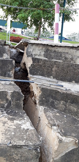 Nhiều vị trí đá lát bong tróc ngổn ngang, các dầm bê tông lớn cũng bị kéo gãy làm thay đổi kết cấu kè. Ảnh: Hoàng Lam
