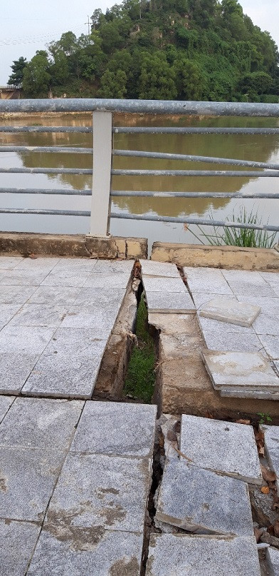 Theo ghi nhận, một đoạn bờ kè bằng bê tông cốt thép dài hơn 60m đã bị xuống cấp, mặt kè lún sâu xuống khoảng hơn 2 m so với mặt bằng ban đầu. Đây là tuyến kè thuộc dự án đầu tư xây dựng công trình xử lý khẩn cấp đê hữu sông Mã. Hiện chính quyền địa phương đã đặt biển cảnh báo. Ảnh: Hoàng Lam