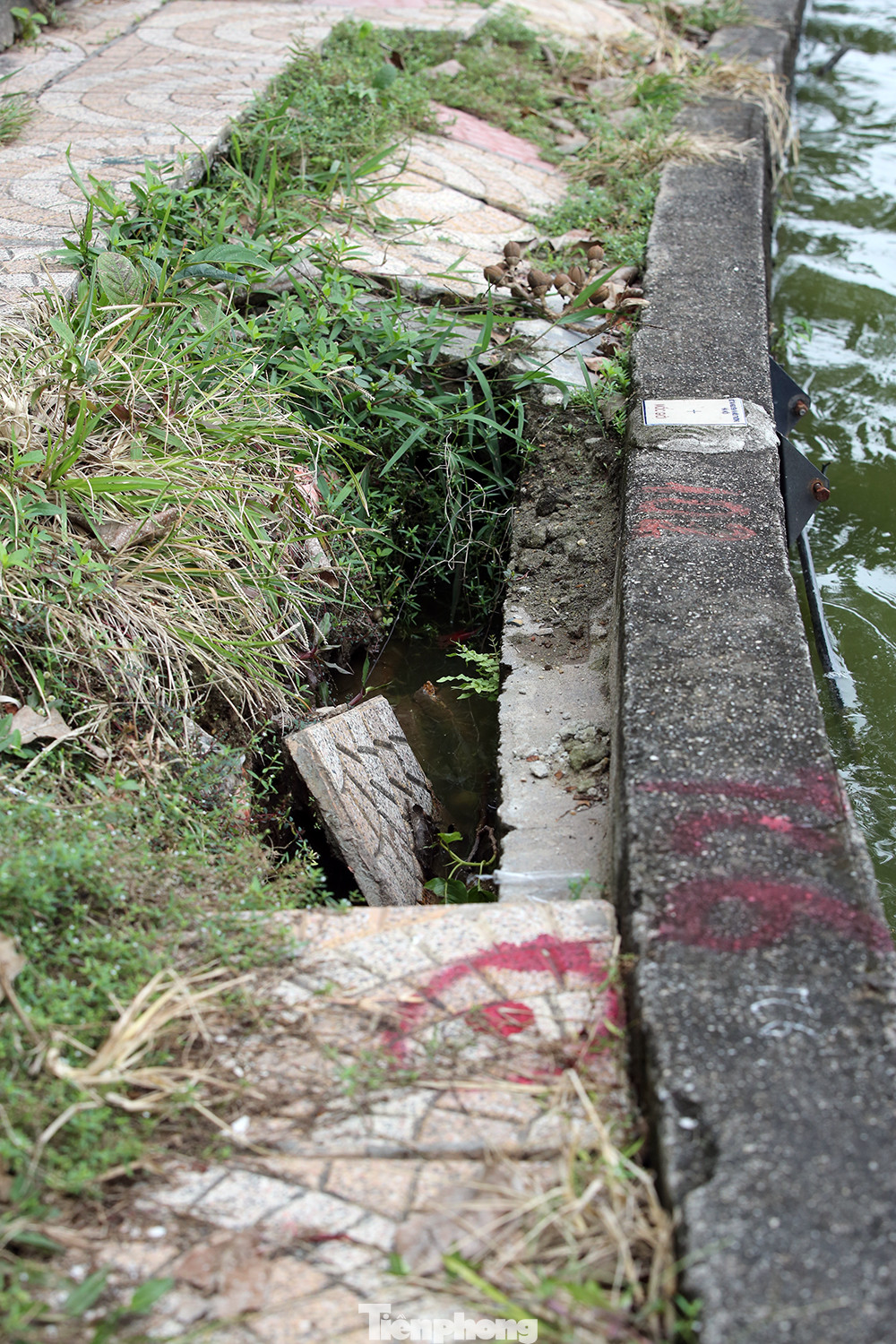 Nhiều đoạn kè gần mặt hồ, cỏ cây mọc um tùm, vật liệu bong tróc vô cùng nhếch nhác.