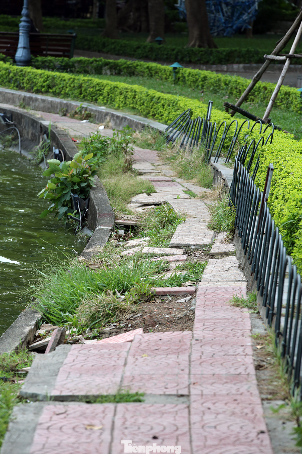 Đến nay, hệ thống kè xung quanh hồ đã xuống cấp, nhiều vị trí đã mất chân kè dẫn đến hệ thống đường dạo sát mép hồ nhiều điểm bị lún sụt.