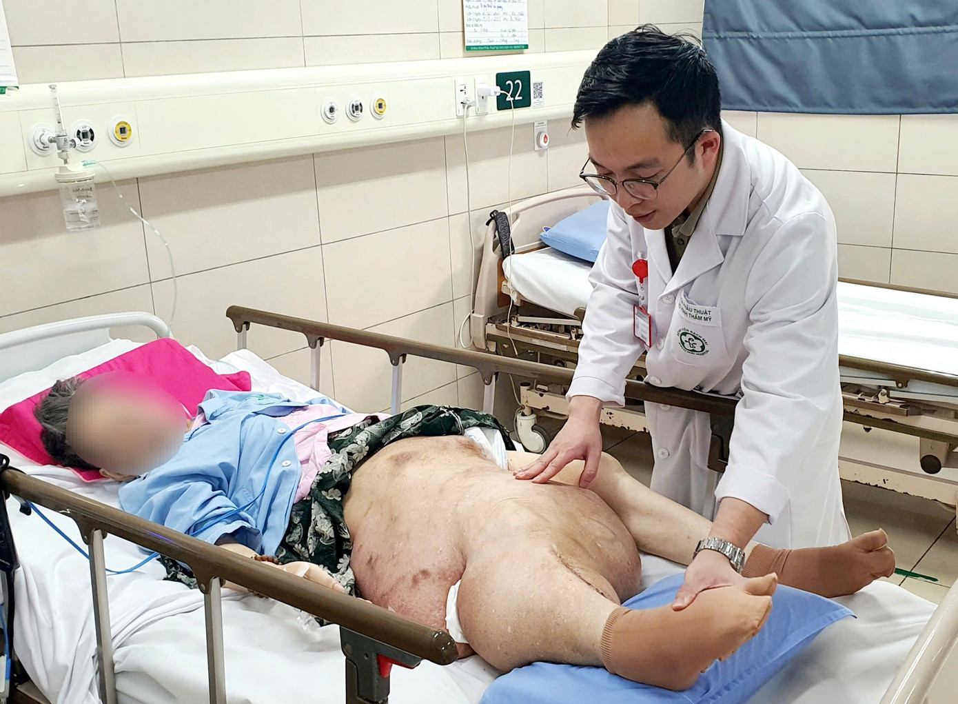 ThS. BS Nguyễn Hữu Trọng khoa Phẫu thuật Tạo hình Thẩm mỹ kiểm tra khối u chân phải của bệnh nhân. Ảnh: Bệnh viện Bạch Mai