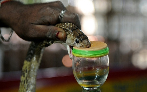 Hợp tác xã của người Irula do một nhà bảo tồn người Mỹ tên Rom Whitaker thành lập, hiện nằm dưới sự điều hành của chính quyền địa phương. Những con rắn bắt được bị nhốt trong một tháng để thu hoạch nọc độc 4 lần. Họ sẽ giữ đầu và ấn răng nanh con rắn vào lớp da trên miệng cốc thuỷ tinh để nọc chảy xuống. Ảnh:Alamy.