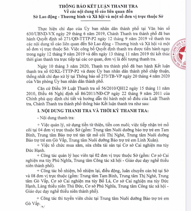 Như Tiền Phong phản ánh, ngày 11/5, Thanh tra TPHCM đã có thông báo kết luận thanh tra về các nội dung tố cáo liên quan đến Sở LĐTB&XH TPHCM và một số đơn vị trực thuộc sở này.