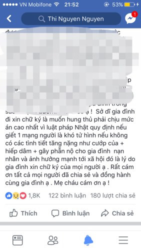 Theo như thông tin chia sẻ từ tài khoản của mẹ bé Nhật Linh với tài khoản Facebook Thi Nguyen Nguyen thì lý do muốn xin 50.000 chữ kí cho con vì “gia đình muốn hung thủ phải chịu mức án cao nhất”. Tài khoản được xác định là mẹ Nhật Linh viết: “vì luật pháp Nhật quy định nếu giết 1 mạng người là khó tử hình nếu không có các tình tiết tăng nặng như cướp của, hiếp dâm, gây phẫn nộ cho gia đình nạn nhân và ảnh hưởng mạnh tới xã hội đó là lý do gia đình xin chữ ký của mọi người ạ. Rất cám ơn tất cả mọi người đã chia sẻ và đồng hành cùng gia đình. Mẹ cháu cám ơn ạ!"