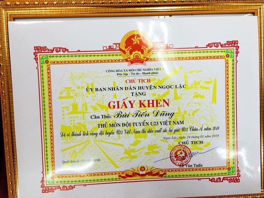 Ghi nhận thành tích xuất sắc của thủ môn Bùi Tiến Dũng cùng tuyển U23 Việt Nam thi đấu xuất sắc tại vòng chung kết U23 châu Á, Chủ tịch UBND huyện Ngọc Lặc Lê Văn Tuấn đã quyết định tặng giấy khen của UBND huyện quê hương và thưởng nóng số tiền 5 triệu đồng. Do Bùi Tiến Dũng đang sát cánh cùng đồng đội, tích cực chuẩn bị cho trận chung kết trong mơ, đại diện gia đình gồm bà và cha mẹ anh đã bày tỏ sự cảm ơn, xúc động và thay mặt nhận các phần thưởng, sự động viên khích lệ của chính quyền địa phương.