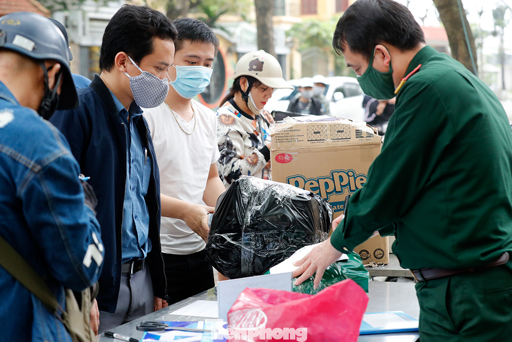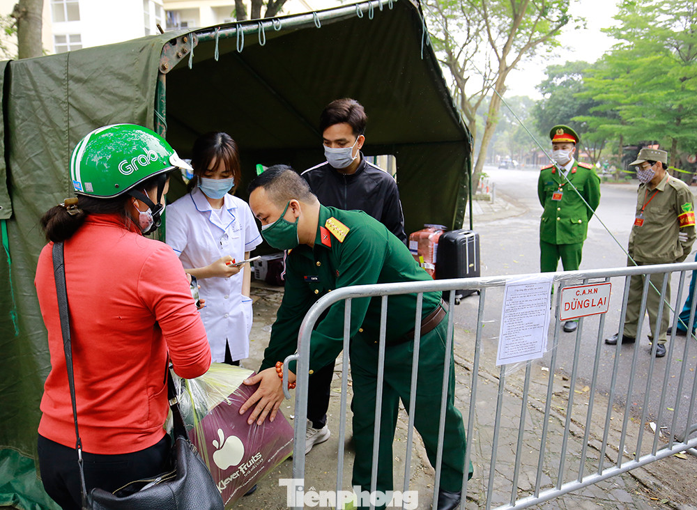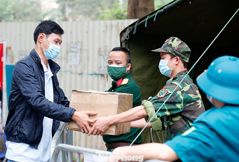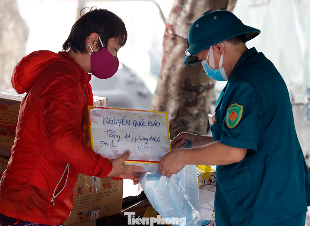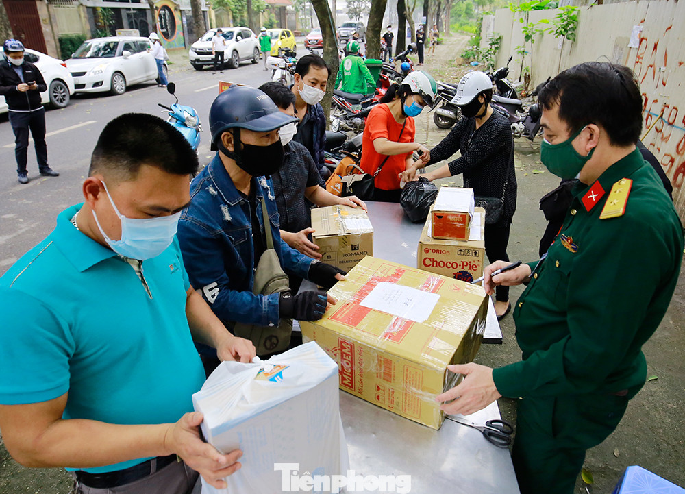 Ngươi dân lỉnh kỉnh mang nhu yếu phẩm đến giao cho lực lượng bồ đội nhờ mang tiếp tế cho con đi từ vùng dịch về đang ở khu cách ly Pháp Vân - Tứ Hiệp (Hà Nội)