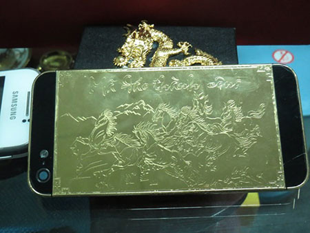 Bên cạnh bộ quà tặng Bát Mã mạ vàng giá bạc tỷ, một trong những dòng sản phẩm độc, lạ với giá cả phải chăng được đông đảo khách hàng lựa chọn dịp Tết Nguyên đán 2014 là iPhone 5S mạ vàng 24K phiên bản "mã đáo thành công".