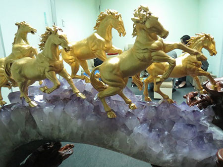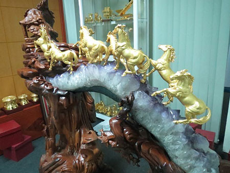 8 chú ngựa vàng được đứng trên một bộ lũa, bao gồm gốc cây cổ thụ và một cây cầu được đẽo gọt từ một phiến đá thạch anh tím quý giá.