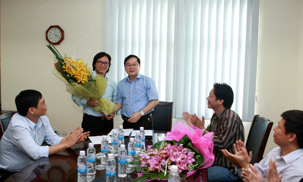 Tổng Biên tập Lê Xuân Sơn chúc mừng nhà báo Lê Anh Đạt.