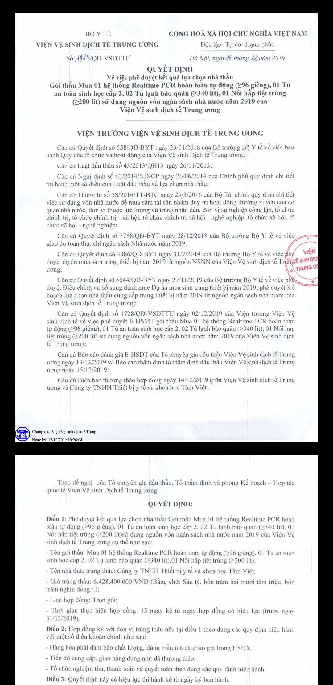 Tiếp đó, ngày 16/12/2019, Viện trưởng Viện Vệ sinh dịch tễ TƯ ra quyết định mua cũng của Công ty TNHH thiết bị y tế và khoa học Tâm Việt một hệ thống Realtime PRC 480 model Cobas@ 4.800 của hãng Roche (Thuỵ Sỹ) và 1 tủ an toàn sinh học cấp 2, 2 tủ lạnh bảo quản, 1 nồi hấp tiệt trùng với tổng giá 6,428,4 tỷ đồng. Trong đó, riêng hệ thống máy Realtime RRC 480 có giá khoảng 5,9 tỷ đồng.