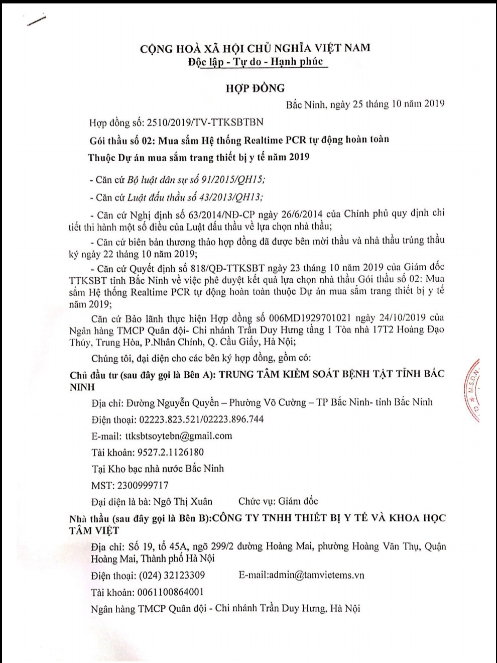 Cụ thể, ngày 25/10/2019, CDC Bắc Ninh ký hợp đồng mua máy của Công ty TNHH thiết bị y tế và khoa học Tâm Việt với chỉ duy nhất hệ thống Realtime PRC 480 model Cobas@ 4.800 của hãng Roche (Thuỵ Sỹ) với giá 5,905 tỷ đồng, không có các thiết bị phụ trợ như tủ lạnh âm sâu, tủ an toàn sinh học, máy ly tâm…