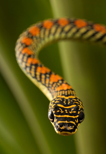 Rắn bay có thể nhảy hoặc “bay” từ cành cây này sang cành cây khác với khoảng cách tối thiểu là...24m với tốc độ dao động từ 8m/s - 10m/s. Ảnh Lazerhorse.
