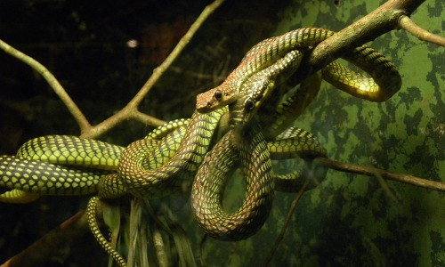 Rắn bay có độc nhưng độc của nó không gây nguy hiểm cho con người mà chỉ gây đau đớn. Ảnh Wikimedia.