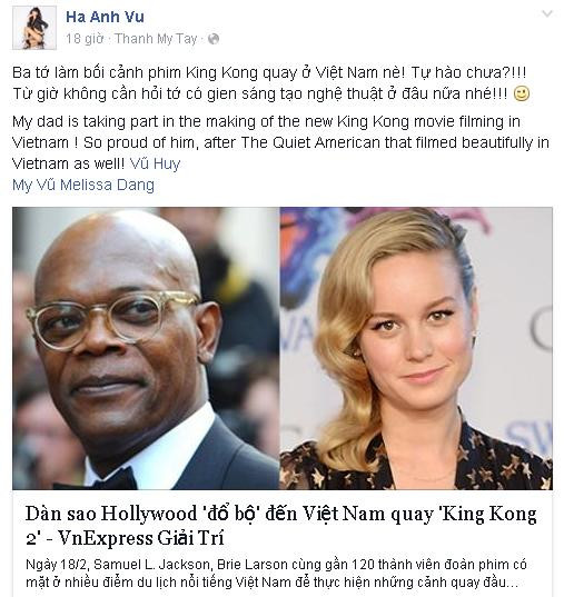 Ngay lập tức, siêu mẫu Hà Anh đã tự hào chia sẻ trên trang cá nhân: "Ba tớ làm bối cảnh phim King Kong quay ở Việt Nam nè! Tự hào chưa? Từ giờ không cần hỏi tớ có gien sáng tạo nghệ thuật ở đâu nữa nhé!".