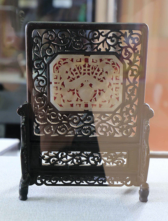 Bình phong bằng gỗ được kết hợp hài hòa với hoạ tiết chạm khắc ngọc ở chính giữa.