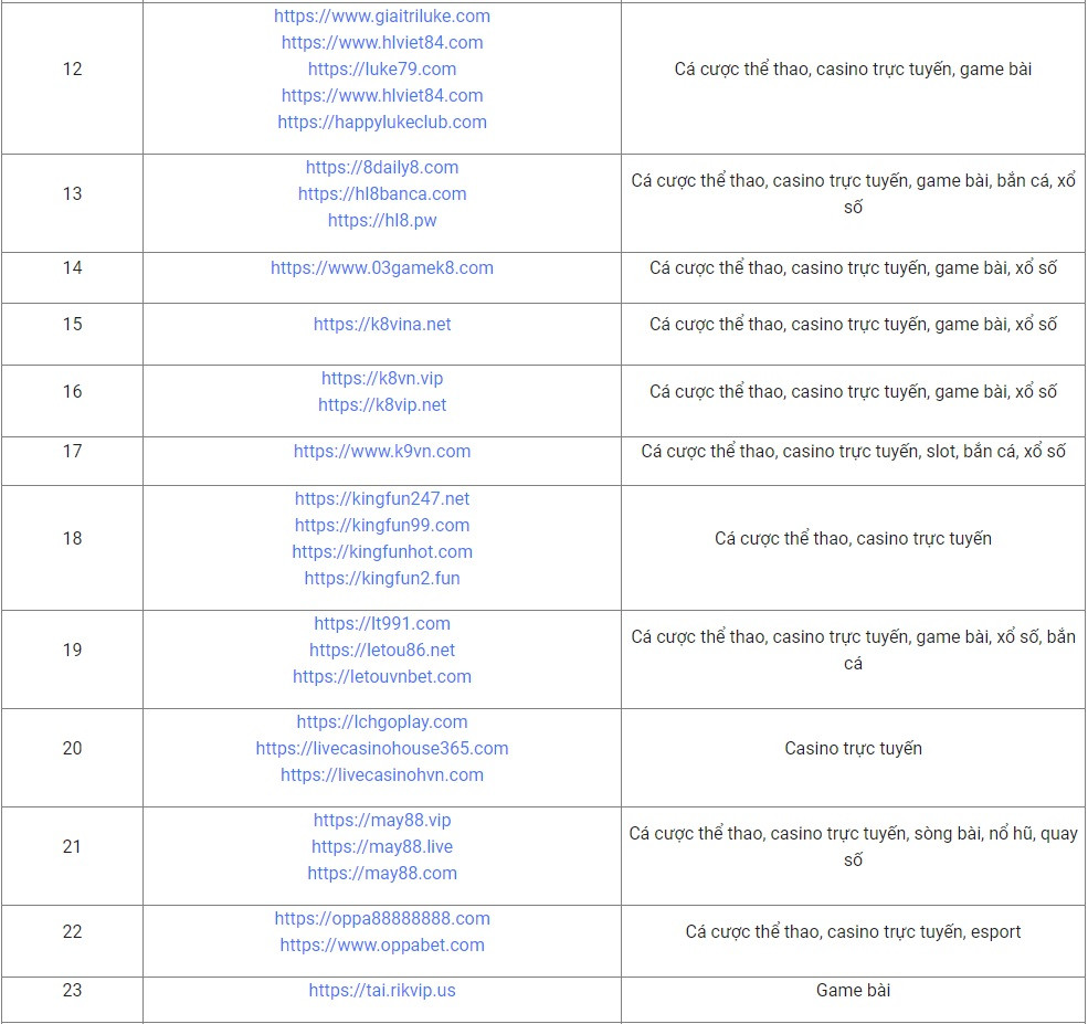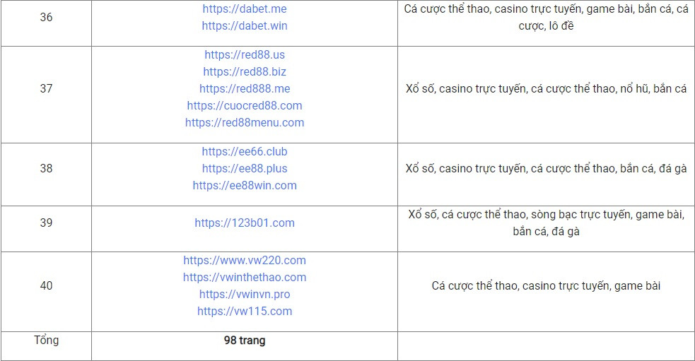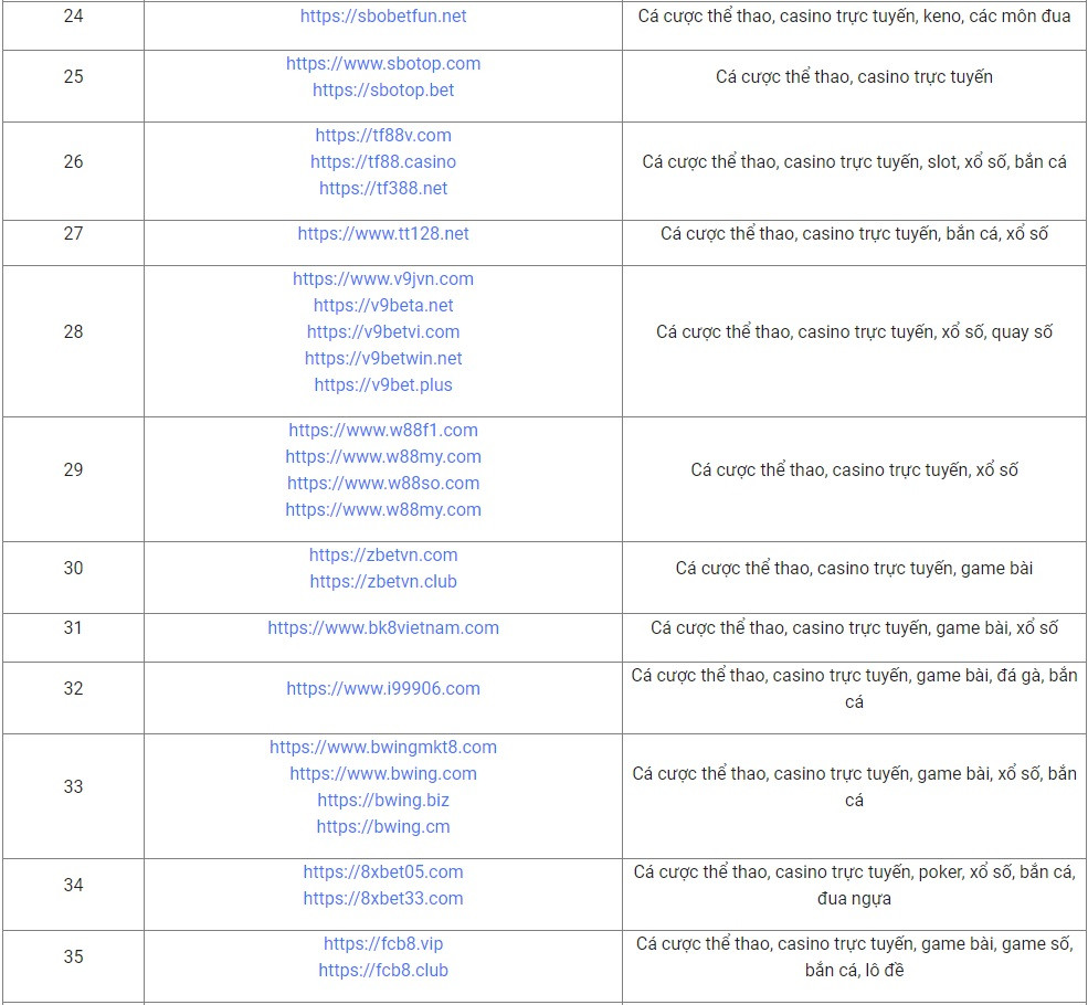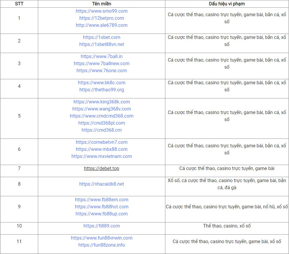 Thực hiện quy định trên, Bộ Thông tin và Truyền thông công bố danh sách các trang thông tin điện tử vi phạm pháp luật (cung cấp nội dung quảng cáo cá độ, cung cấp trò chơi điện tử trái phép có tính chất cờ bạc, đổi thưởng …) để người kinh doanh dịch vụ quảng cáo, người phát hành quảng cáo, người quảng cáo lưu ý không phát hành sản phẩm quảng cáo trên các trang thông tin điện tử này.