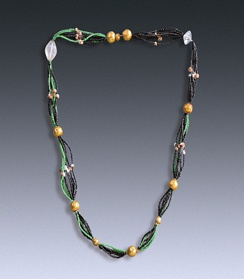 Chiếc dây chuyền bao gồm 10 hạt vàng cỡ lớn và nhỏ, 9 miếng vàng dẹt, hai hạt pha lê, 42 viên ngọc trai và hơn 4.800 hạt thủy tinh nhỏ. Hạt thủy tinh có cỡ bằng hạt kê, màu xanh và đen, tất cả đều dẹt với lỗ xuyên ở giữa.