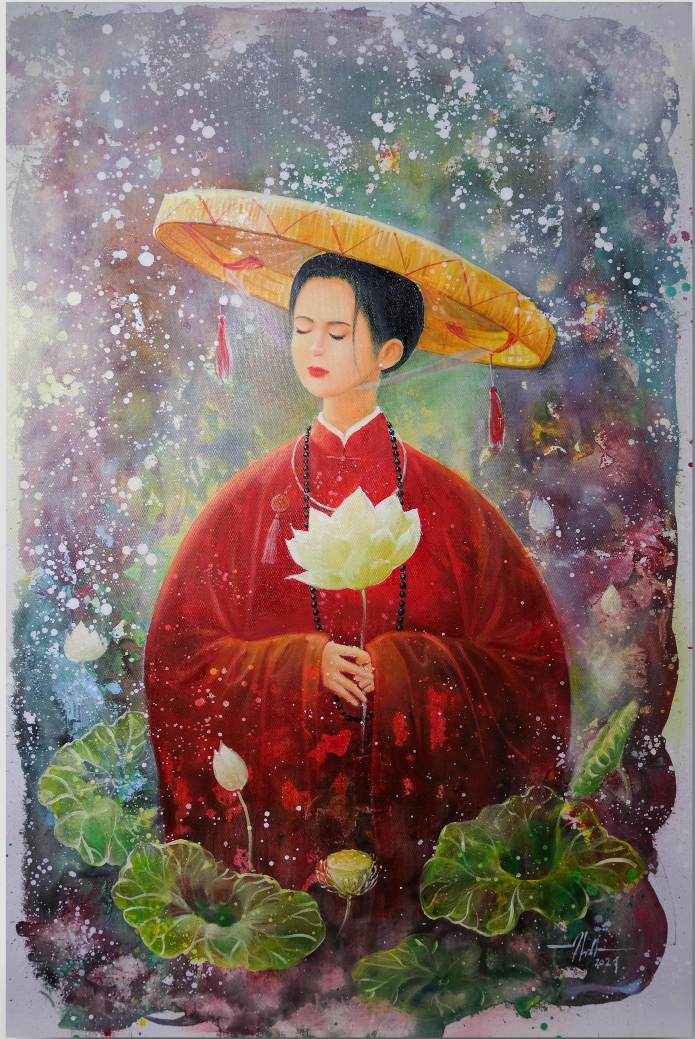 Đức Thành chia sẻ thêm, anh không thuê người mẫu ngồi làm mẫu cho mình vẽ, mà chỉ dựa theo một vài dáng người, liên tưởng, tưởng tượng hình dáng, trang phục, hoa sen,… trong đầu để vẽ ra. Những điều này chắc chắn chỉ có ở những người họa sĩ đã có kinh nghiệm, quan sát và trải nghiệm rất nhiều.