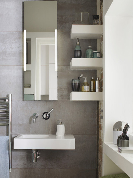 Nhà tắm kiêm nhà vệ sinh hẹp nên gương, bồn rửa tay... đều khá hẹp.