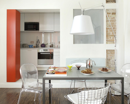 Màu đỏ của vách ngăn giữa phòng khách và phòng ngủ được lặp lại ở phần cửa giữa nơi ăn uống và bếp. Không chỉ thế, phần tường còn lại ngăn với khu phụ cũng được tạo dựng biến hóa với gạch mộc, tường trắng và kính mờ.