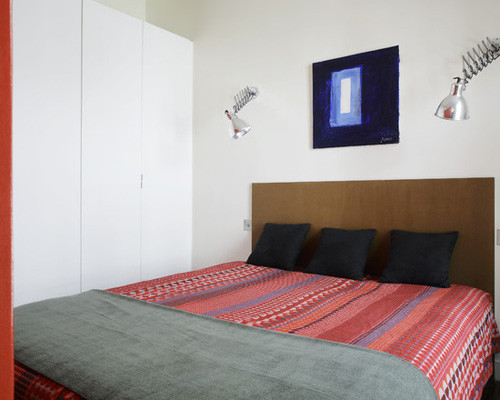 Chiếc giường lớn với tông màu ấm áp. Để tiết kiếm diện tích, chủ nhà lựa chọn kiểu đèn đóng vào tường. Tủ quần áo màu trắng đồng màu với tường giảm cảm giác chật chội.