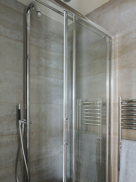 Phòng tắm đứng sử dụng kính trong để phân cách với khu vực khô trong nhà vệ sinh.