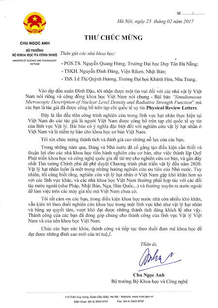 Trong thư, Bộ trưởng chia sẻ, đây là tin vui đối với các nhà vật lý Việt Nam nói riêng và cộng đồng khoa học Việt Nam nói chung.