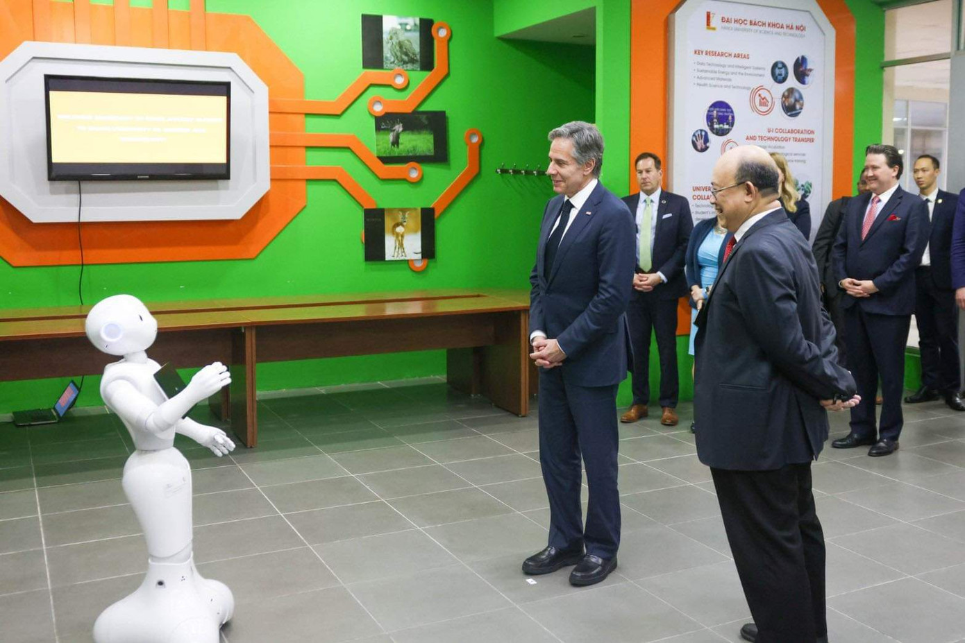 Trong chuyến thăm, Bộ trưởng Blinken tham quan một số nghiên cứu của trường về trí tuệ nhân tạo (AI), robot và máy lọc không khí, đồng thời thảo luận về khả năng hợp tác của HUST và Đại sứ quán Mỹ nhằm thúc đẩy các hoạt động nghiên cứu và phát triển, đổi mới sáng tạo và giáo dục khoa học.