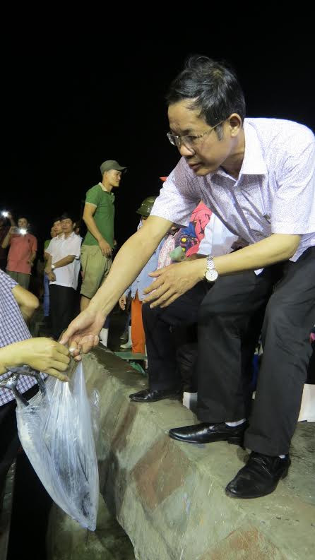 Thấy người dân xuống cảng chờ tàu để mua cá nhưng còn ngần ngừ, Bộ trưởng Trương Minh Tuấn đã tự tay lấy cá từ hầm đá mời gọi mọi người cùng mua giúp ngư dân. Trước sự động viên của Bộ trưởng, rất nhiều người dân đã mua cá về ăn.