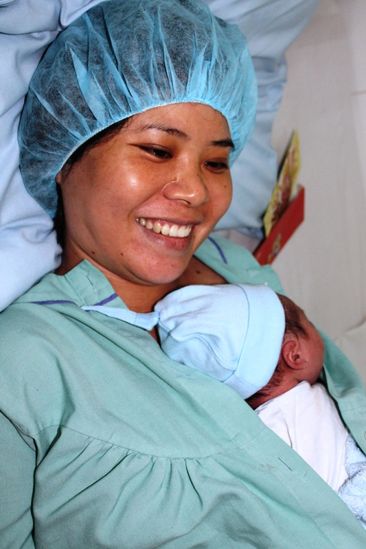 Niềm vui của sản phụ Trần Thị Nhung khi được Bộ trưởng Bộ Y tế thăm hỏi, chúc Tết. Ảnh: Việt Văn.