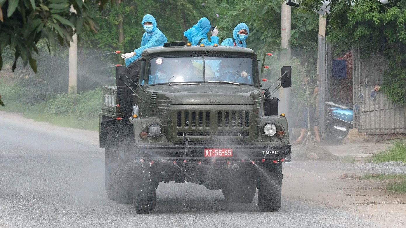 Các xe đặc chủng nối đuôi nhau phun khử khuẩn một cách kỹ lưỡng.