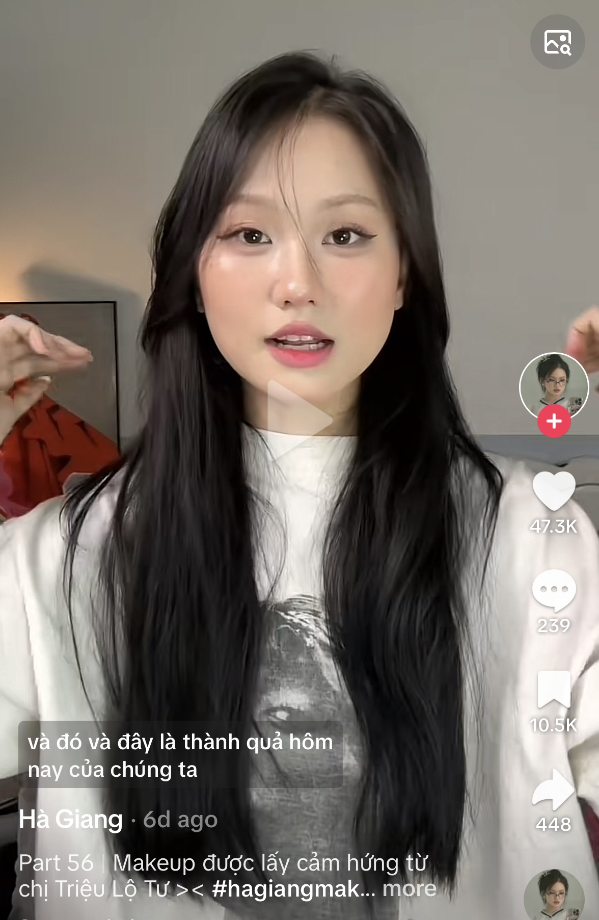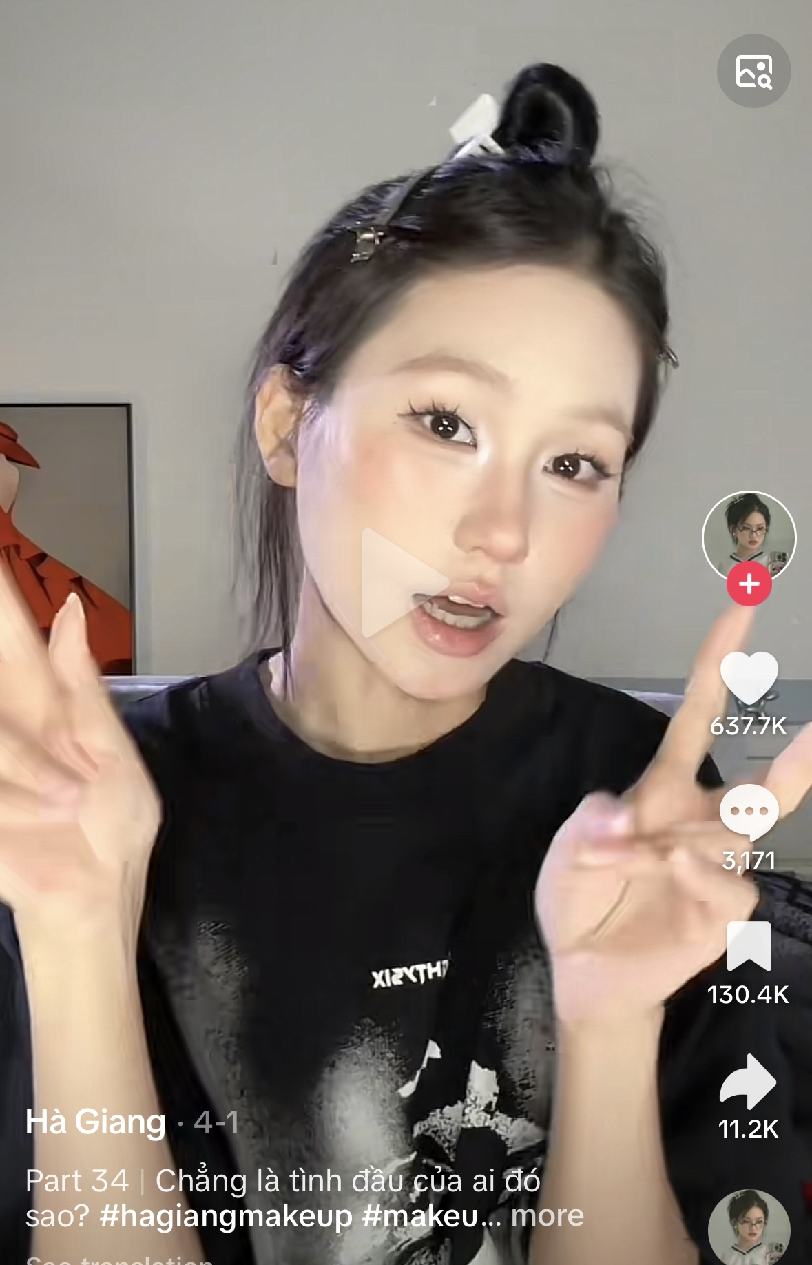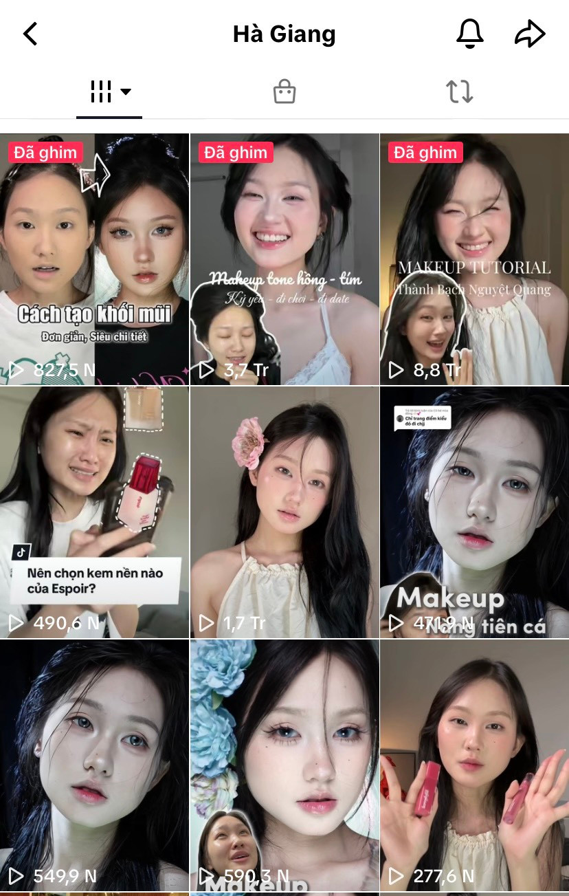 Kênh TikTok @ciaramakeup2003 của cô nàng Hà Giang đã có hơn 1,1 triệu người theo dõi với những video makeup kiểu trong sáng và nhẹ nhàng. Kênh của chị Giang sẽ thường là các video makeup tutorial, hướng dẫn từ A đến Z cách trang điểm để chụp kỉ yếu, đi chơi, hoặc kiểu makeup trở thành “Bạch Nguyệt Quang” trong truyền thuyết. Những kiểu trang điểm của chị hầu hết sẽ được lấy cảm hứng từ kiểu makeup của các tỉ tỉ Douyin Trung Quốc.