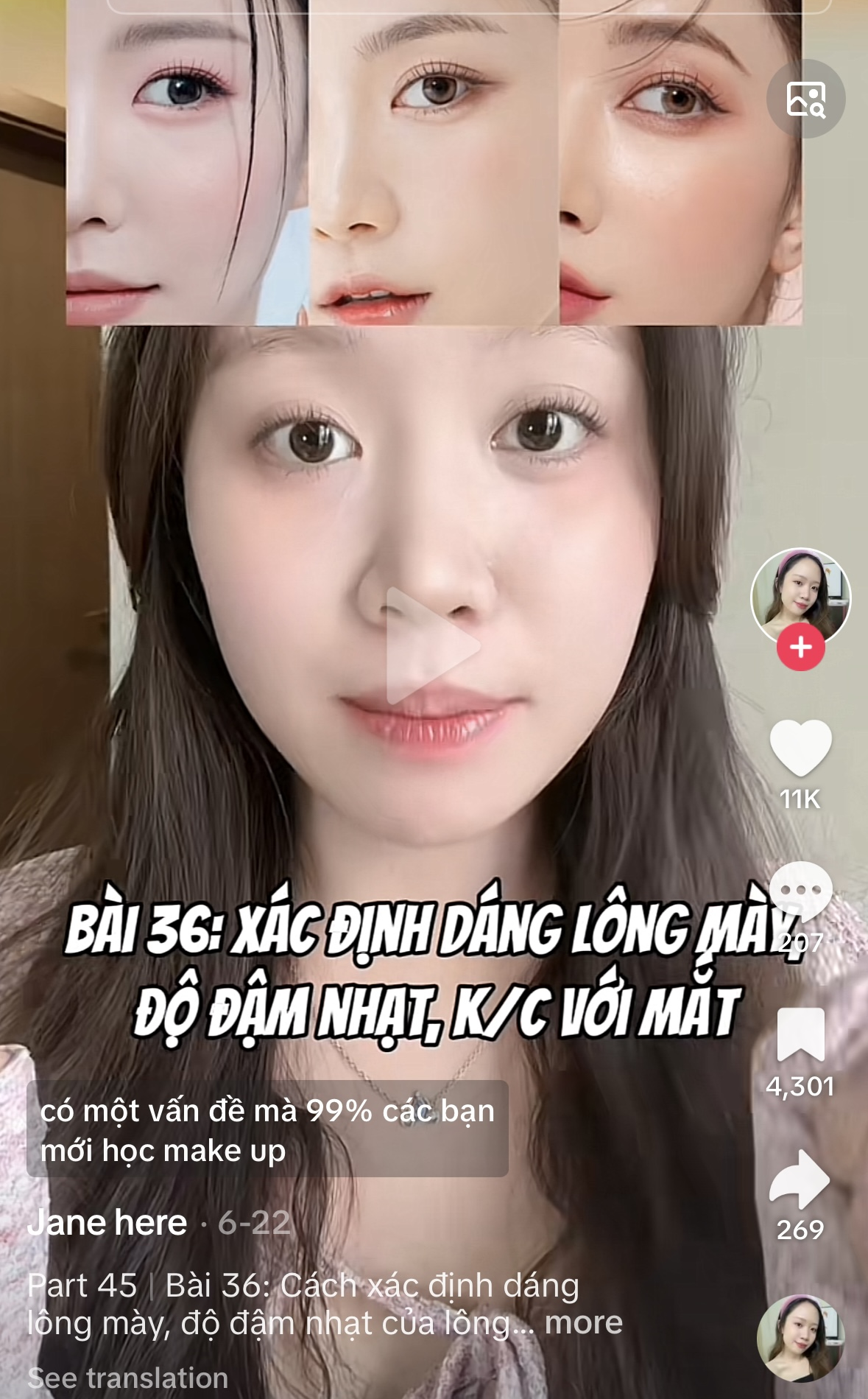 Chị Jane Here (kênh TikTok @janehere_official) được mọi người biết đến với những video chi tiết các bước makeup phù hợp từng dáng mặt, dáng mắt và tông màu riêng.