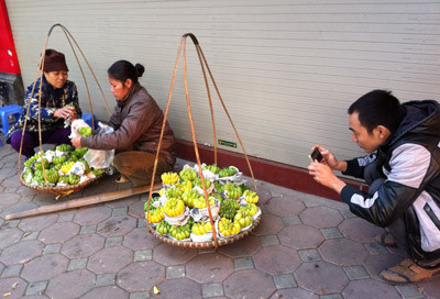 Người phụ nữ gánh hai rổ quả phật thủ đi bán dạo trên hè phố Trần Hưng Đạo (TP Hà Nội) được một người gọi mua. Mỗi quả mấy chục nghìn, quả rẻ nhất chỉ 20.000 đồng. Giá mỗi quả tiền triệu là ở đâu đó, còn chị gánh hàng rong nhỏ nhẹ tâm sự: Bây giờ nhiều người trồng được nên giá rẻ, không biết có kiếm được tiền tiêu Tết hay không?