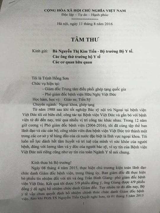 "Tôi viết tâm thư này khẳng định với Bộ trưởng rằng mình sẽ không rời Bệnh viện Việt Đức, vì tôi đã giành toàn bộ tâm huyết và công sức ở đó để phát triển ngành ngoại khoa, trong đó có ghép tạng. Tôi rất mong Bộ trưởng với trọng trách sẽ quyết định đúng đắn sáng suốt và không điều động tôi về làm giám đốc Bệnh viện Hữu Nghị," giáo sư Sơn bày tỏ trong bức thư.