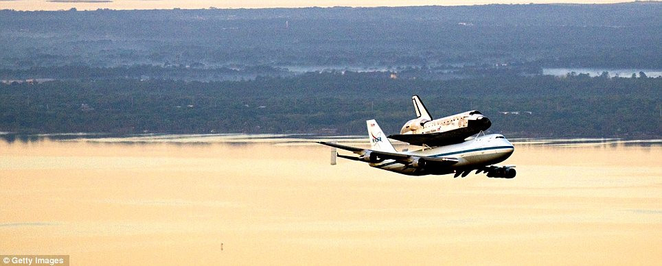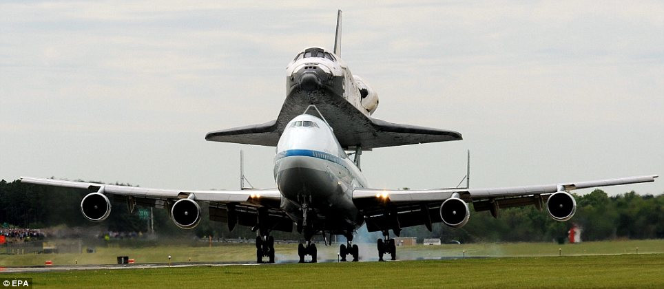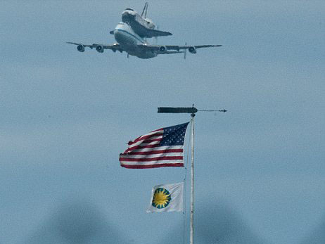 Boeing 747 cõng tàu con thoi bay bốn vòng trước đài tưởng niệm Washington, bay qua trung tâm mua sắm quốc gia, qua Capitol Hill và hạ cánh ở sân bay Dulles, Washington.