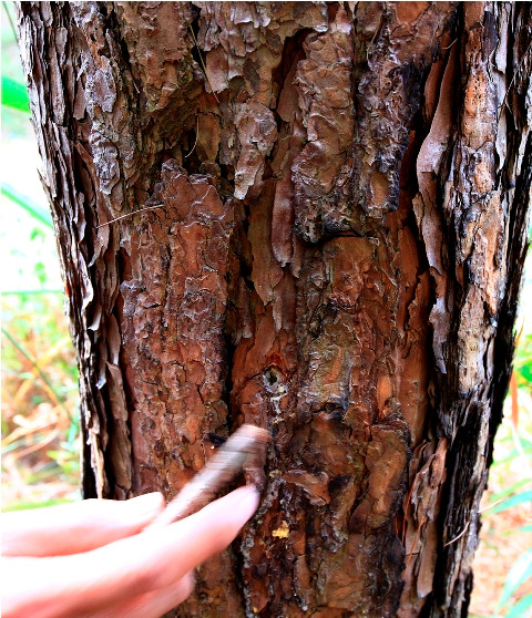 Đối tượng phá rừng đã khoan lỗ ở gốc thông (mỗi cây 2-3 lỗ) rồi bơm hóa chất vào để đầu độc thông. Ngọn thông héo rũ, lá chuyển từ xanh sang vàng và rụng dần; cây sẽ khô dần rồi chết, không gì cứu vãn được.
