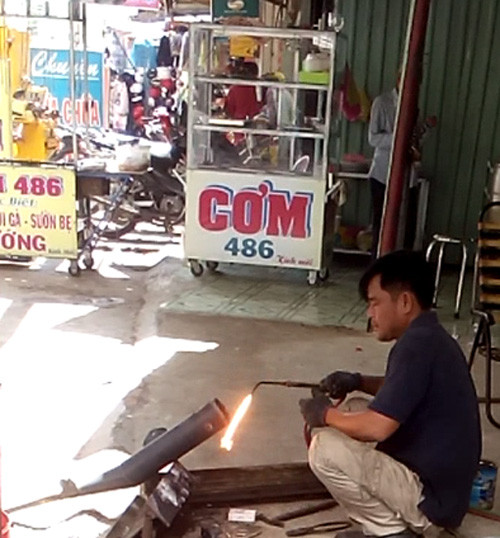 Không chỉ lo sợ những quả “bom” gas, mà một số tiệm hàn kim loại, sửa pô xe có sử dụng bình hàn gió đá cũng khiến người dân địa phương như ngồi trên đống lửa.