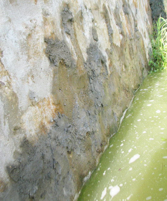 Vết nứt xé trên mặt, phía trong con đập; bêtông bị bong tróc, vỡ từng mảng.