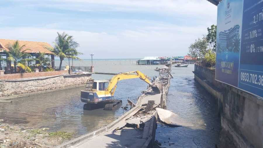 Trước tình hình trên, theo chỉ đạo của UBND huyện Phú Quốc, UBND xã Hàm Ninh đã thông báo cưỡng chế buộc tháo dỡ cầu cảng.