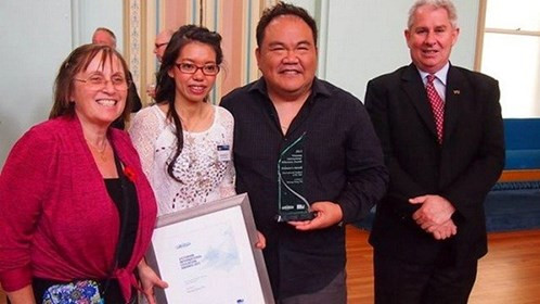 Đặng Thị Hương nhận giải thưởng cùng với đại diện của tổ chức KOTO quốc tế.