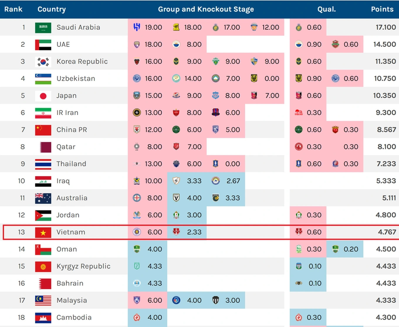 Như vậy, bóng đá Việt Nam đã nhảy vọt từ vị trí thứ 20 lên 13 châu Á. Đây cũng là lần hiếm hoi bóng đá Việt Nam thăng tiến mạnh mẽ như vậy trên bảng xếp hạng cấp CLB.