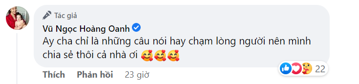 Theo đó, người đẹp phủ nhận hoàn toàn việc cô và chồng đã ly hôn. Bình luận dưới bài viết của chính mình, Hoàng Oanh chia sẻ: "Ay cha chỉ là những câu nói hay chạm lòng người nên mình chia sẻ thôi cả nhà ơi". Ngay sau câu trả lời của người đẹp, nhiều khán giả bày tỏ sự hi vọng cặp đôi sẽ luôn giữ được hạnh phúc của mình và sẽ sớm đăng tải những khoảnh khắc đáng yêu của gia đình nhỏ lên YouTube.