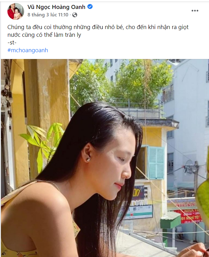 Ngày 8/3, Hoàng Oanh bất ngờ đăng dòng trạng thái đầy tâm trạng khiến cộng đồng mạng xôn xao. Cụ thể, Á hậu Hoàng Oanh viết: "Chúng ta đều coi thường những điều nhỏ bé, cho đến khi nhận ra giọt nước cũng có thể làm tràn ly".