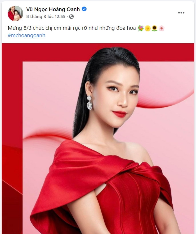 Cũng trong ngày 8/3, Hoàng Oanh còn đăng hình ảnh đằm thắm, xinh đẹp trong chiếc váy đỏ rực rỡ và không quên nhắn gửi tới phái đẹp một lời chúc ý nghĩa: "Mừng 8/3 chúc chị em mãi rực rỡ như những đóa hoa".
