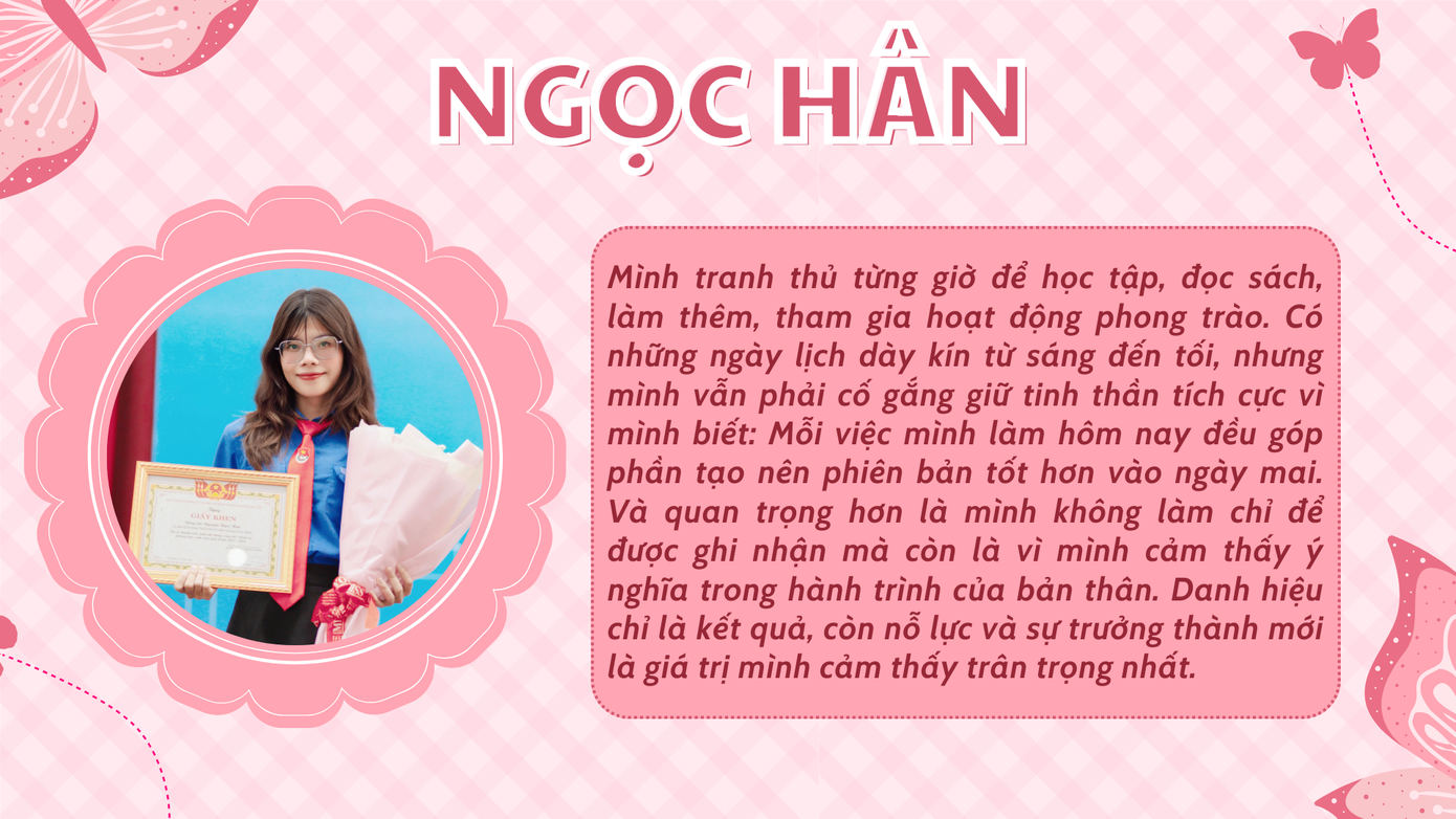 Ngọc Hân từng bắt đầu hành trình đại học muộn hơn bạn bè đồng trang lứa vì một số biến cố cá nhân. Khi trở lại giảng đường với tư cách là một tân sinh viên lần thứ hai, Hân không tránh khỏi cảm giác tự ti, áp lực và thu mình lại trước mọi người. Thế nhưng, cô bạn tình cờ đọc được một câu nói và đã giúp bản thân thay đổi suy nghĩ: “Vốn dĩ mỗi người đều có múi giờ riêng để phát triển bản thân. Nếu bạn là một bông hoa nở muộn, cũng chẳng sao cả. Vì đến cuối cùng, tất cả đều đúng giờ”. Từ đó, Hân nhận ra rằng không ai có hành trình giống ai và không ai đến đích giống nhau,thay vì so sánh hãy sống trọn vẹn từng ngày với sự nỗ lực cao nhất. Cô bắt đầu tập trung học tập, tham gia sôi nổi các hoạt động Đoàn - Hội, cống hiến sức trẻ nhiệt huyết. Chính niềm tin vào bản thân cùng sự kiên trì đã giúp Hân từng bước vượt qua khó khăn, một hành trình tuy bắt đầu muộn nhưng đầy ý nghĩa và đáng để tự hào.